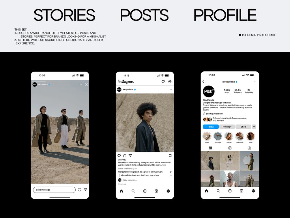 7 separate files including Instagram profile, posts, stories, as well as 7 ready-made mockups. Edittext, colors and backgrounds.